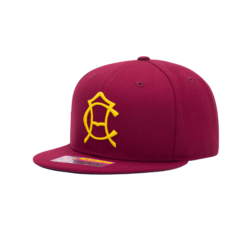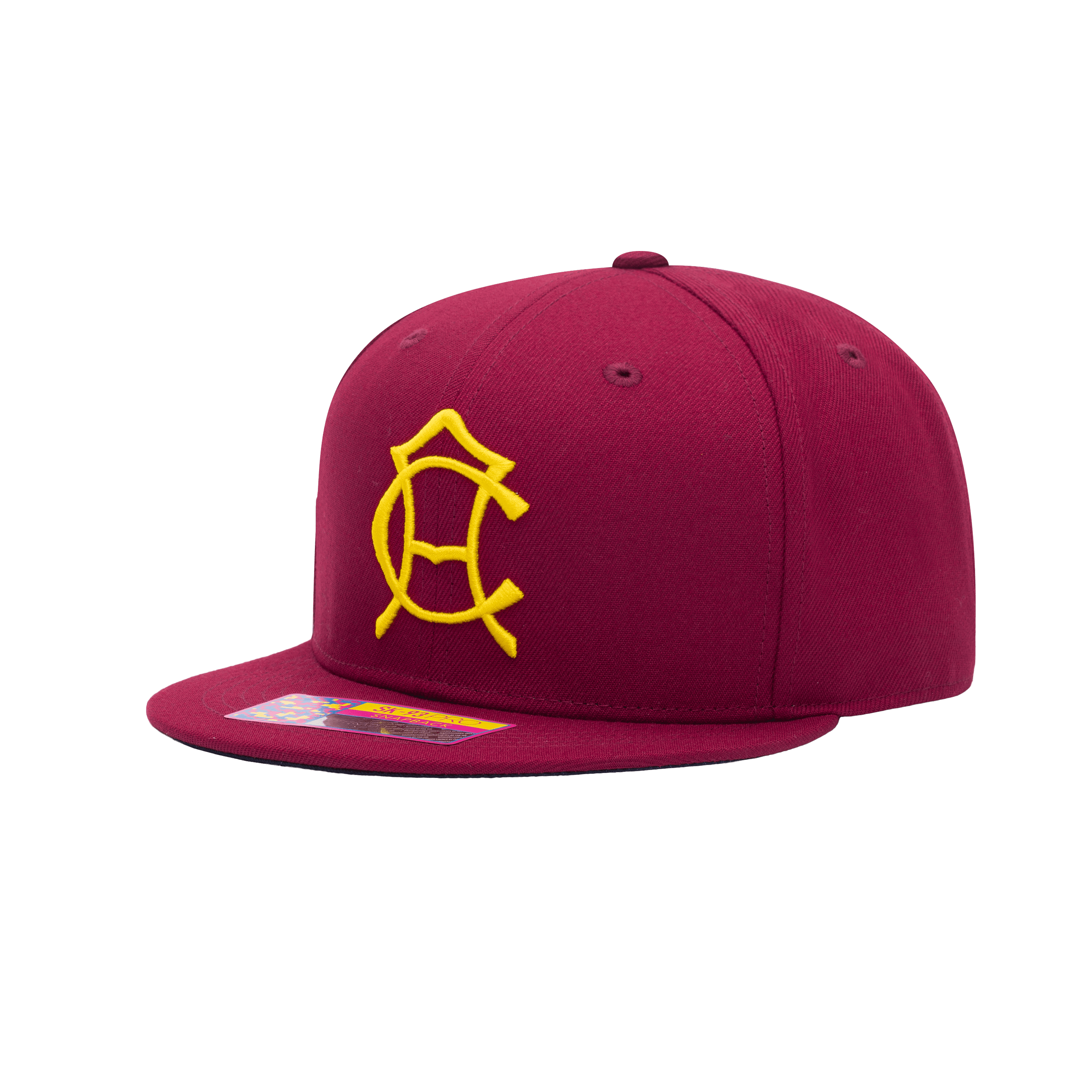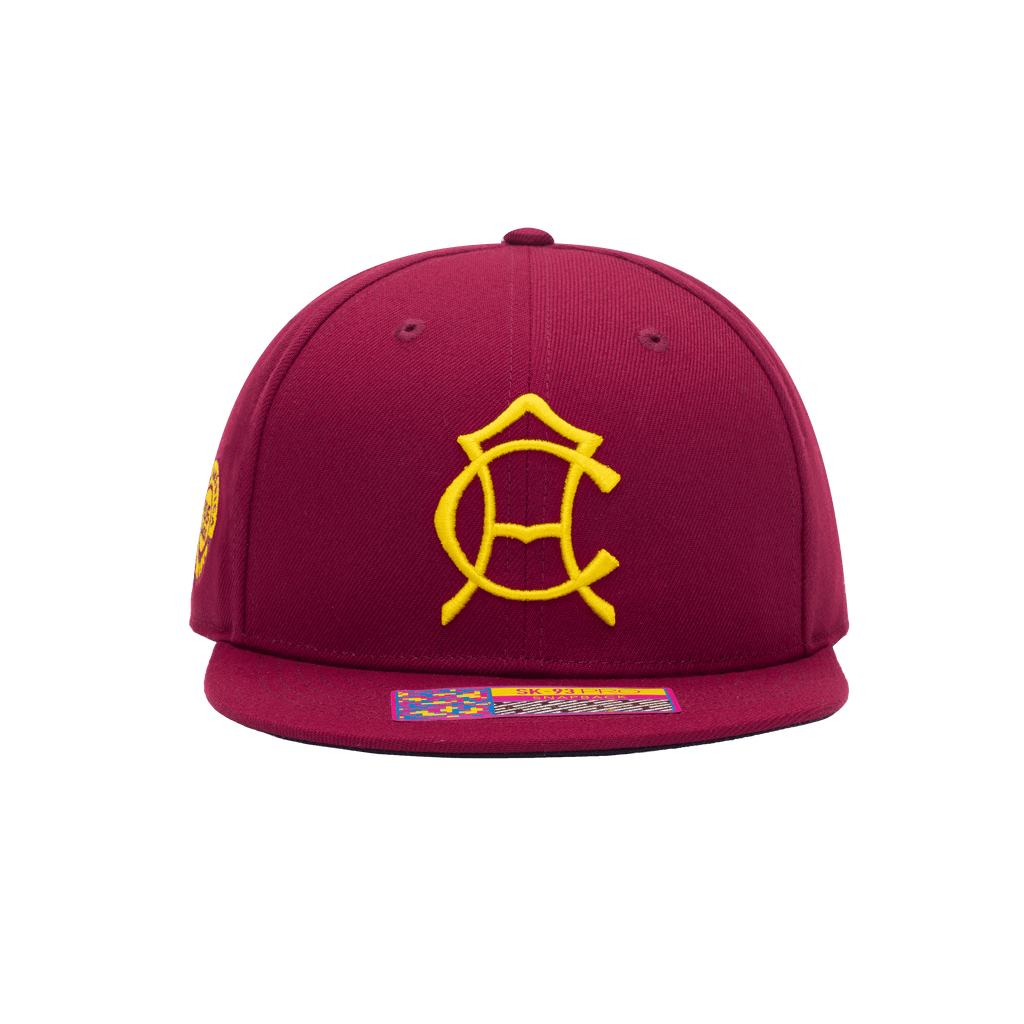Front view of the Club America 105th Anniversary Retro Snapback with high crown, flat peak, and snapback closure, in Burgundy.