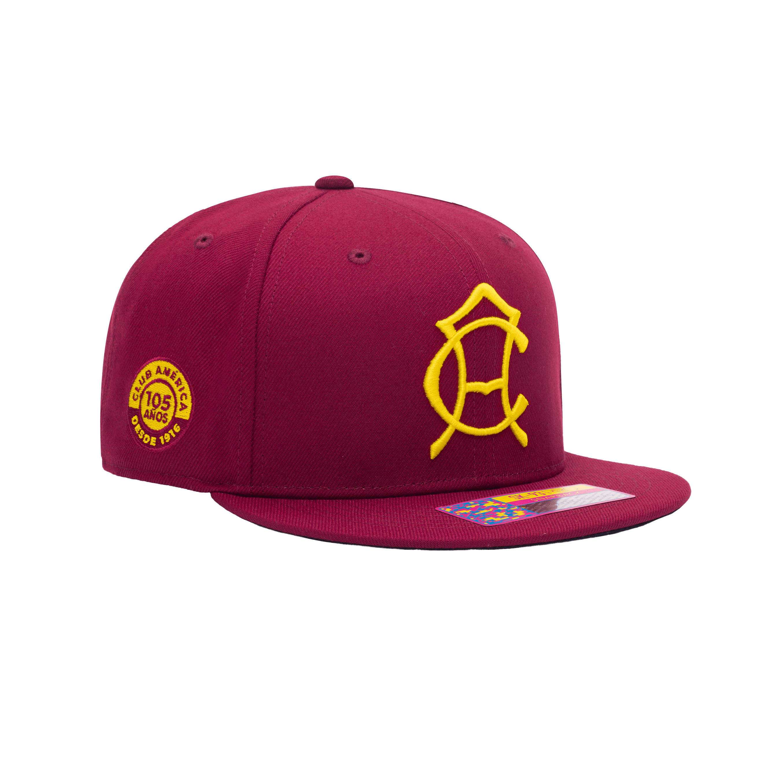 Side view of the Club America 105th Anniversary Retro Snapback with high crown, flat peak, and snapback closure, in Burgundy.